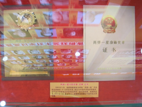 中国科技大学首任化学物理系系主任郭永怀的“两弹一星”勋章出现在科教展区入口处。该展品从中国科技大学征集。展品中的说明为“2003年9月,郭永怀夫人李佩将其捐赠给中国科技大学珍藏”。