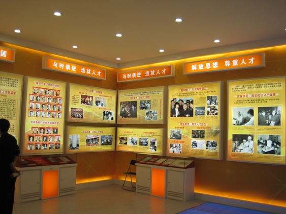 科教展厅入口处,图中左侧的玻璃柜台为中国科技大学提供的郭永怀烈士“两弹一星”勋章,图中最右下照片为中国科技大学营养餐厅。