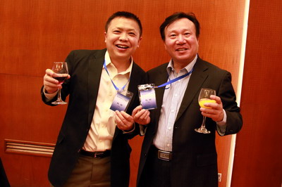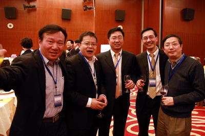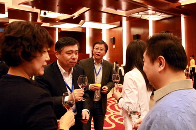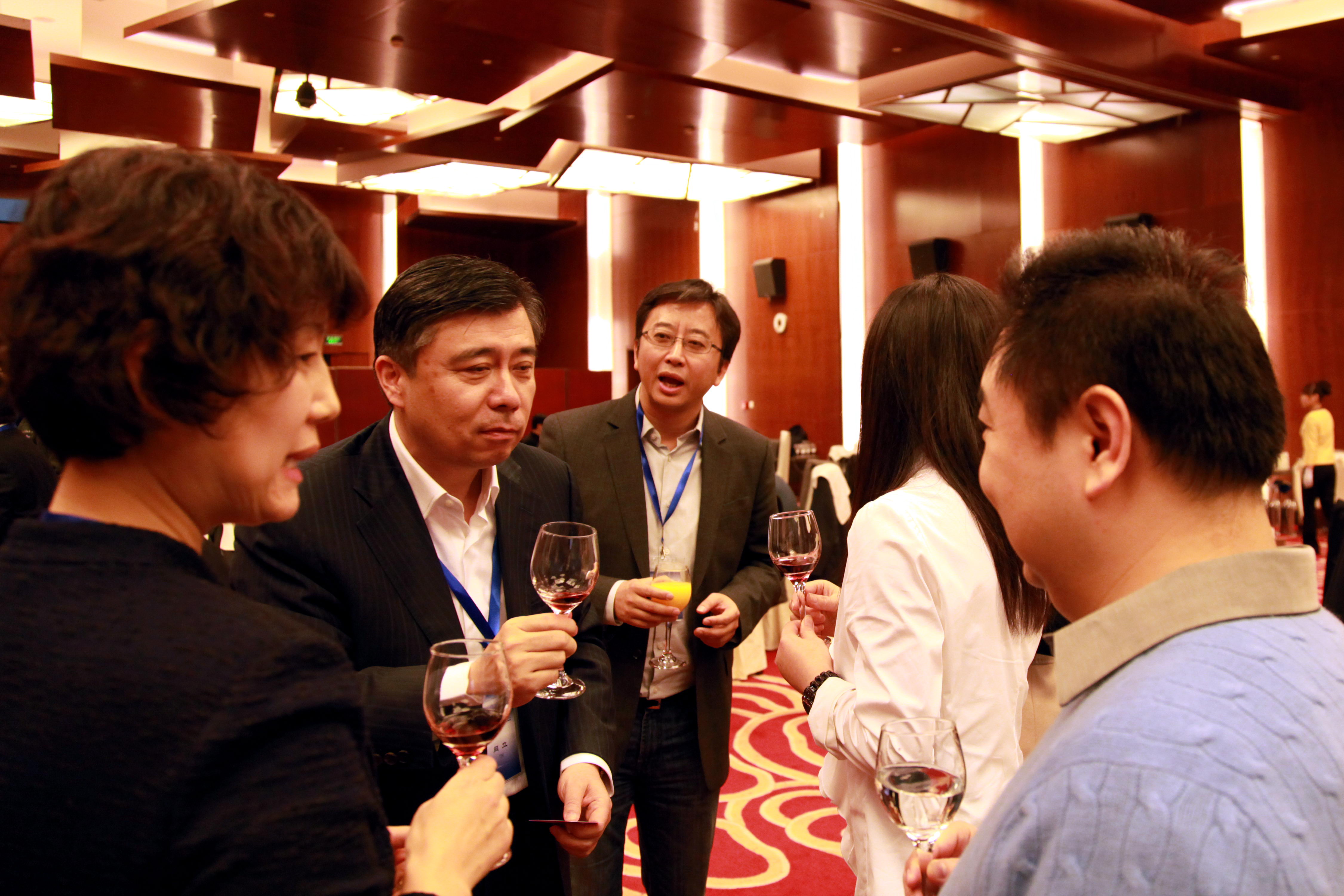 阎立与郭去疾(9400,LightInThebox董事长)交谈中。图中左起孟秋月、阎立、白强、 汪健、郭去疾。白强创办的公司业务为3D影视,自称好莱坞娱乐圈人士。
