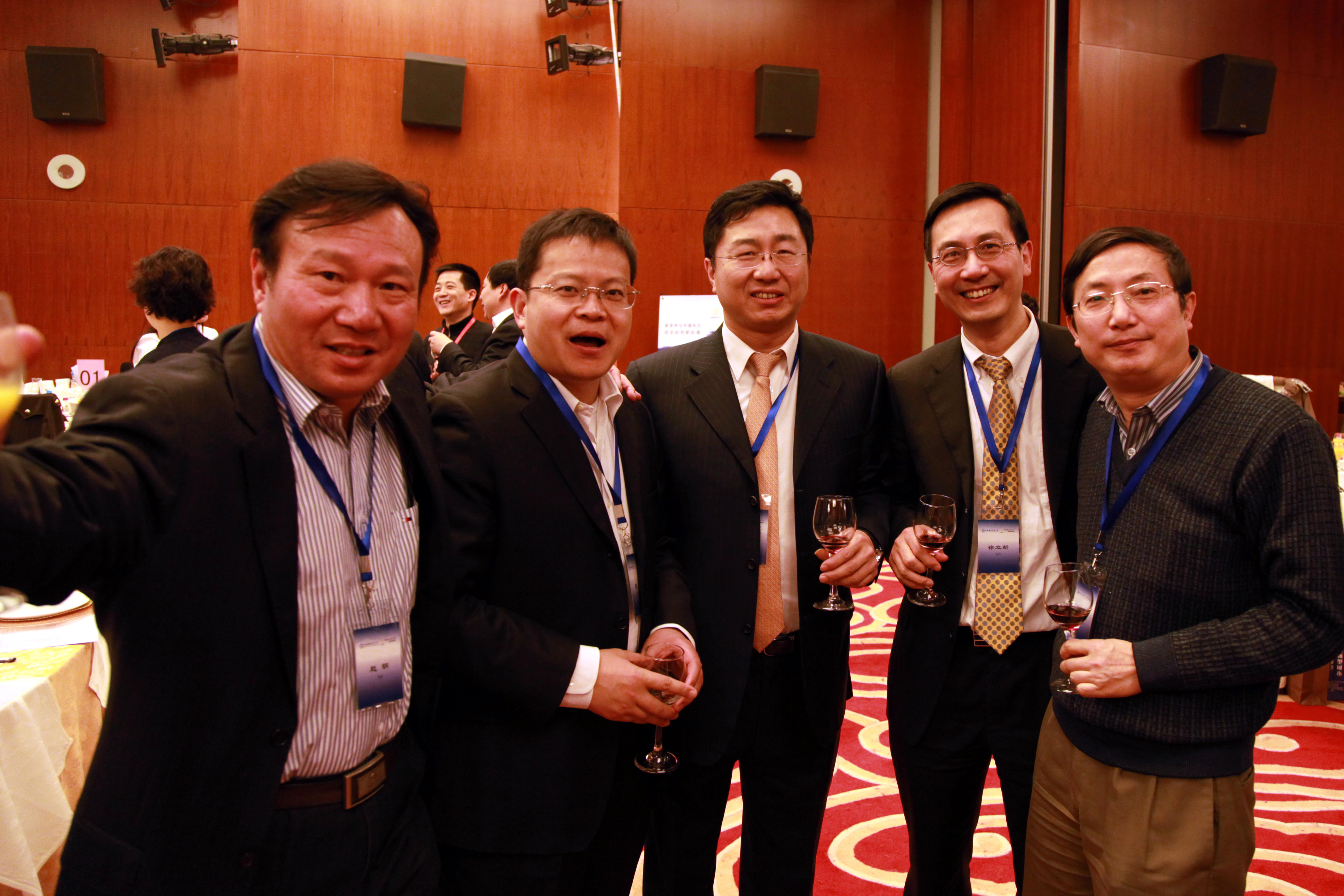 与会的部分校友合影。左起赵钢(799,万国数据副总裁)、袁超(84少,中国人保资本有限公司 董事长)、郭元林(78少)、徐立新(858,名力中国成长基金管理合伙人)、隋文泉(806,苏州通创微芯董事长)。