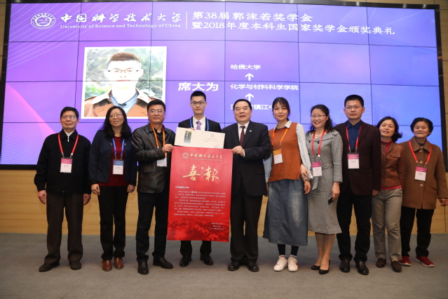 在颁奖环节,包信和校长首先为郭沫若奖学金获奖学生逐一颁发获奖证书,为获奖学生中学校长颁赠喜报,并与获奖学生及其家长、中学校长、中学和大学老师代表一同合影留念。随后,他为2018年度国家奖学金获奖学生逐一颁发证书,并合影留念。
