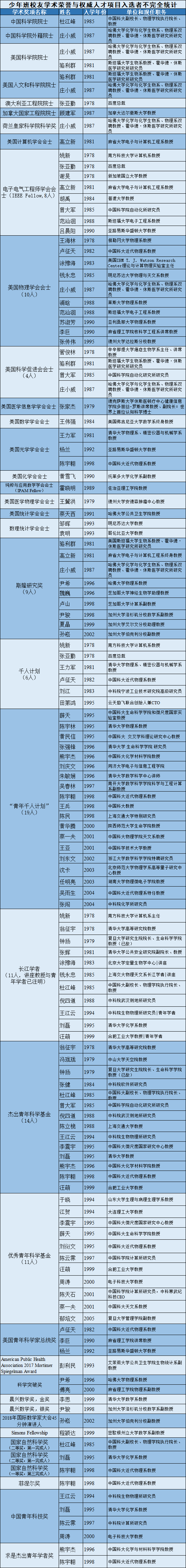 创办于1978年3月8日的中国科学技术大学少年班是中国学术菁英的黄埔军校。2018年适逢中国科大创办60周年、少年班创办40周年。中国科大新创校友基金会与少年班校友会整理了曾获得国内外荣誉称号或权威学术职位的校友不完全名单。
