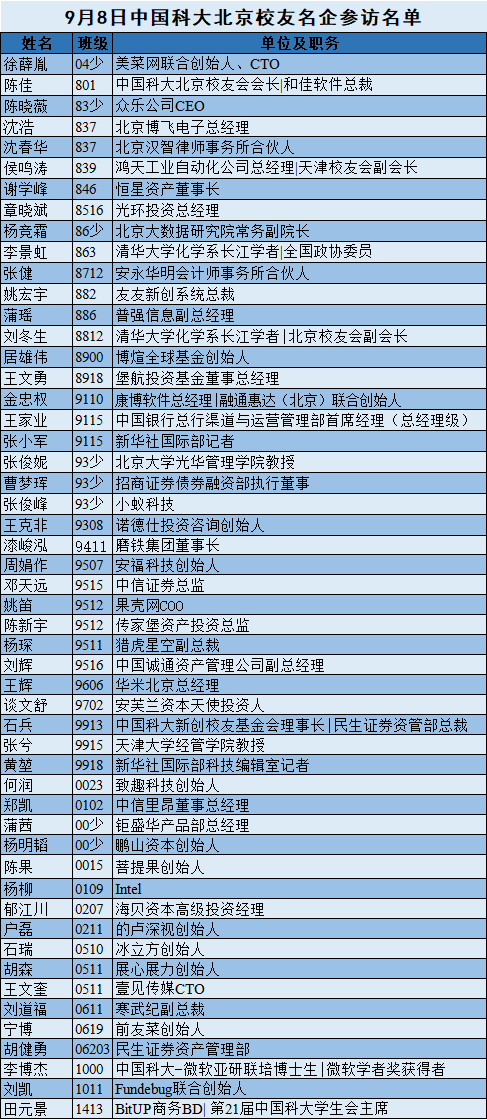 应邀参观美菜网的校友包括中国科大校长俱乐部成员、企业家、创业者与投资人代表、部分感兴趣的学术界校友。尽管接待容量有限,北京校友会仍邀请多位年轻毕业生 代表出席活动。有多位外地校友出席了活动:天津校友会副会长、鸿天工业自动化总经理侯鸣涛(839)、中信证券邓天远(9515)、中信里昂郑凯(0102)等校友分别从天津、深圳与上海前来出席参访。