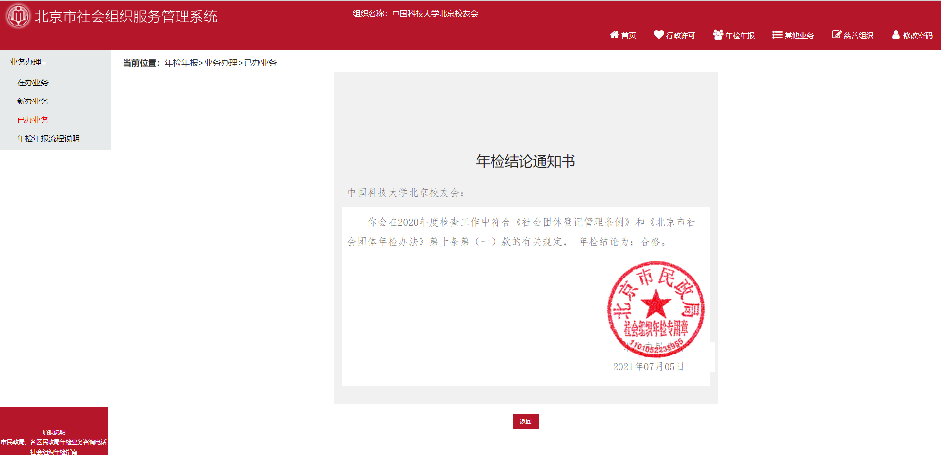 北京校友会年检结论通知书